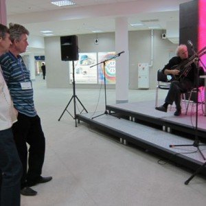I finally arrived at the NAMM event (National Association of Music Marketers) who were sponsoring the first music trade show in Russia. Just tuning up drew a small crowd before being inundated with a multitude of Soviet musicians and salespeople. There enthusiastic response to my music and the harp guitar was overwhelming. I really was not expected the flashing red lights and hands waving in the air.