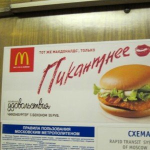 Once on the subway, I tried to find a seat and wanted to blend in. Unfortunately, the only vacant one was between a couple locals who for some reason did not give me the feeling of welcoming a comrade. So I tried to inconspicuously take my place between them while acting like I was engrossed in reading an advertisement for McDonald’s. All I could think about was that slender slice of fried chicken sandwiched between those imposing Russian buns.