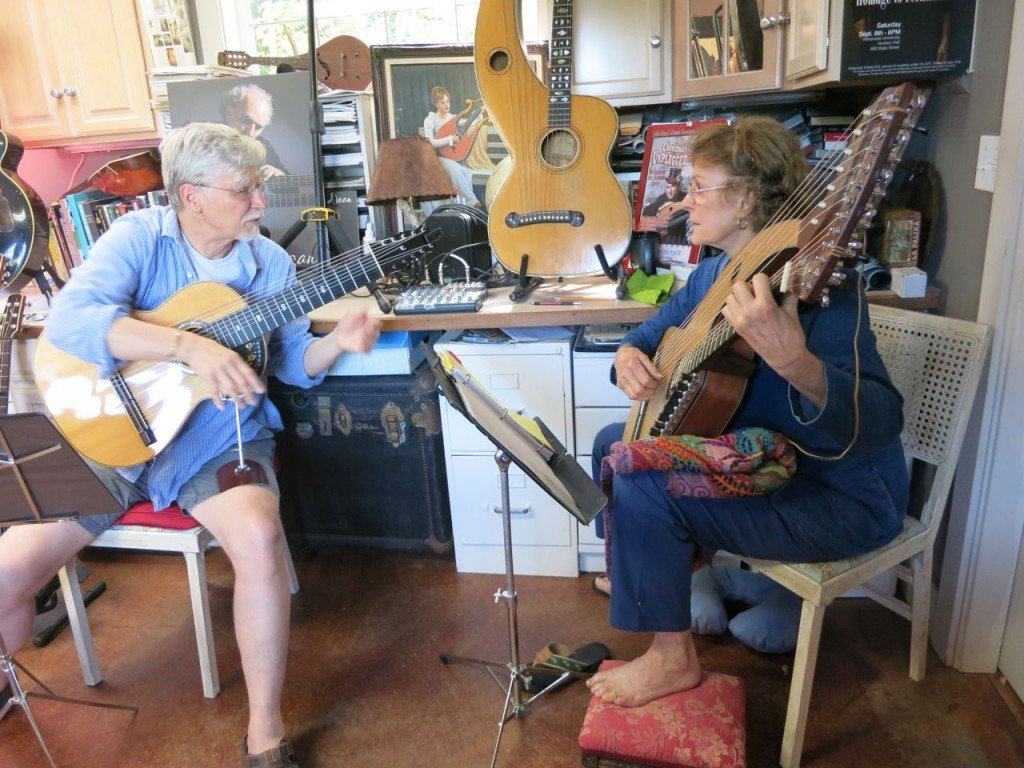 Weekend morning classes began with reviewing various exercises from the new harp guitar instruction book John Doan is preparing for publication.