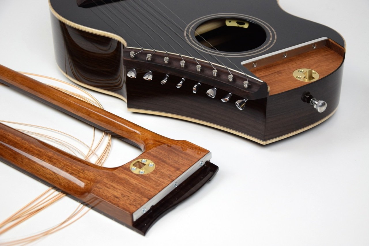 Brunner HG 2015 body neck separated close Published January 7, 2016 at 1280 × 854 in 9th Annual Harp Guitar Retreat June 23rd – 26th “From Basics to Beyond” Brunner Travel Harp Guitar Detached
